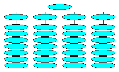 However, in a pure project-based company things are different (see Fig 2). A resource pool of 50 engineers report to their line manager, 50 IT staff report to another line manager, 50 financial experts to another, and 25 project managers to another line manager. And they all sit around doing absolutely nothing, just sit twiddling their thumbs all day. Until, that is, a project comes along. Then a project manager is appointed. He selects 2 sub-project managers, 6 engineers, 8 IT staff and 3 accountants and fits them all into a one-off management hierarchy for the project. At the end of the project they all return to their respective line managers and sit and wait for the next project to come along.